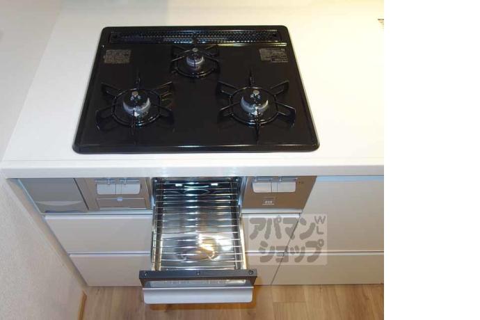 公営水道, 都市ガス, 下水, 専用バス, 専用トイレ, バス・トイレ別, シャワー, ガスコンロ, コンロ三口, システムキッチン, 給湯, シャンプードレッサー, 室内洗濯機置場, バルコニー, フローリング, 駐輪場あり, 光ファイバー, 角部屋, TVドアホン, 温水洗浄便座, カウンターキッチン, 独立洗面台, インターネット利用料無料, シューズボックス, 2人入居可, 保証人不要