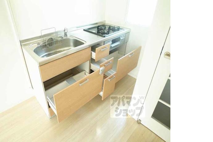公営水道, 都市ガス, 下水, 専用バス, 専用トイレ, バス・トイレ別, シャワー, ガスコンロ, コンロ三口, システムキッチン, 給湯, シャンプードレッサー, エアコン, 室内洗濯機置場, バルコニー, フローリング, 駐輪場あり, バイク置き場あり, 光ファイバー, TVドアホン, 温水洗浄便座, 独立洗面台, シューズボックス, 2人入居可