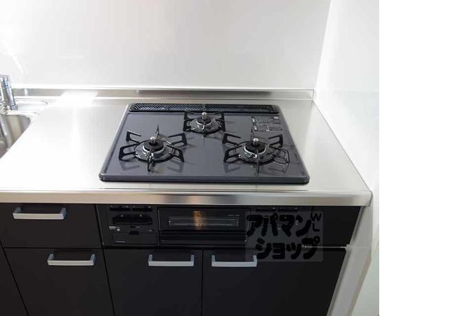 公営水道, 都市ガス, 下水, 専用バス, 専用トイレ, バス・トイレ別, シャワー, ガスコンロ, コンロ三口, システムキッチン, 給湯, シャンプードレッサー, エアコン, 室内洗濯機置場, バルコニー, フローリング, 宅配ボックス, 駐輪場あり, バイク置き場あり, 角部屋, TVドアホン, 温水洗浄便座, 独立洗面台, 防犯カメラ, 警備保障, シューズボックス, 2人入居可