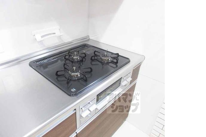 公営水道, 都市ガス, 下水, 専用バス, 専用トイレ, バス・トイレ別, シャワー, ガスコンロ, コンロ三口, システムキッチン, 給湯, エアコン, 室内洗濯機置場, バルコニー, フローリング, 駐輪場あり, TVドアホン, 照明, 2人入居可