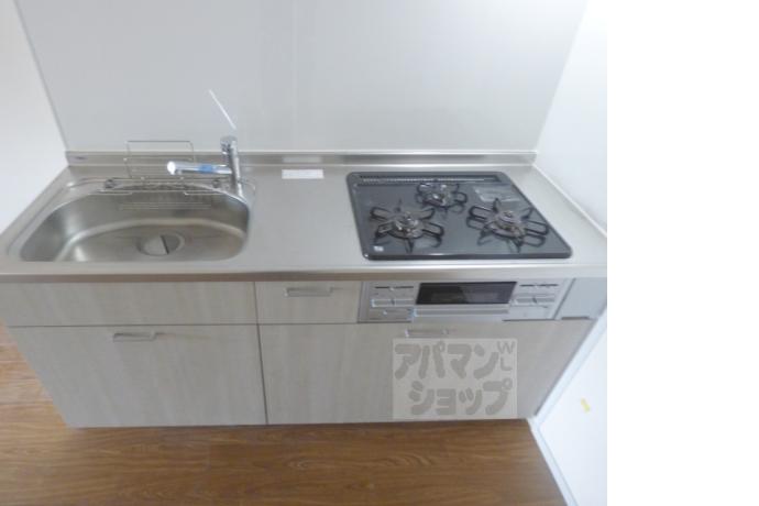 公営水道, 都市ガス, 下水, 専用バス, 専用トイレ, バス・トイレ別, シャワー, ガスコンロ, コンロ三口, システムキッチン, 給湯, 室内洗濯機置場, バルコニー, フローリング, 駐輪場あり, 光ファイバー, 独立洗面台, 2人入居可