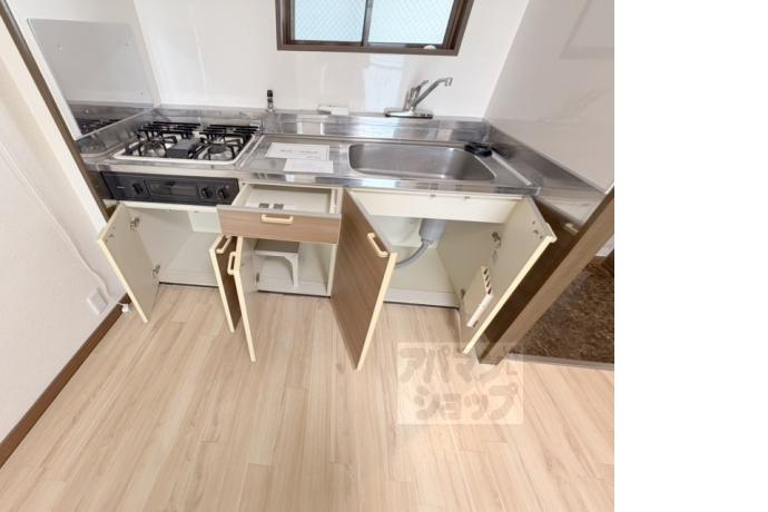 公営水道, 都市ガス, 下水, 専用バス, 専用トイレ, シャワー, ガスコンロ, コンロ二口, システムキッチン, 給湯, バルコニー, フローリング, バイク置き場あり, 光ファイバー, 角部屋, 防犯カメラ, カードキー, 事務所可, 2人入居可